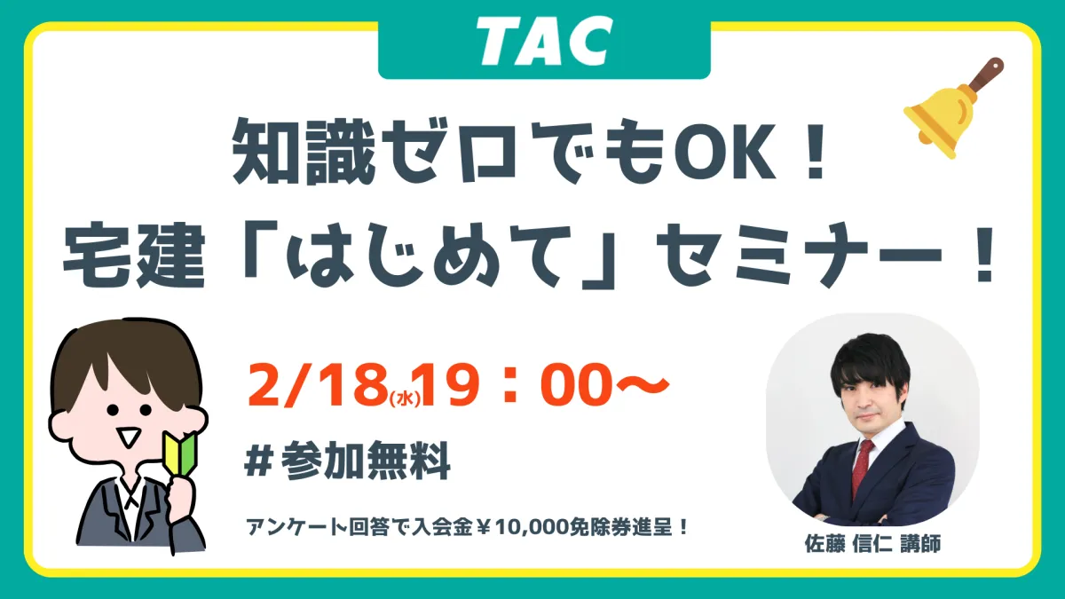 宅建士試験を考えている皆さんに朗報です!TAC(タック)による「宅建はじめてセミナー」が、2026年2月18日(水)19:00からオンライン開催されます。このセミナーは、受講費が無料で、宅建試験についての基礎知識をしっかり学ぶことができるチャンスです。登壇されるのは、TACの人気講師である佐藤信仁(さとう のぶひと)先生。これまでに多くの企業や大学で数々の講義を行ってきた佐藤先生は、法律用語を分かりやすい言葉に置き換える技術に長けていて、受講者の理解を深める講義を展開します。