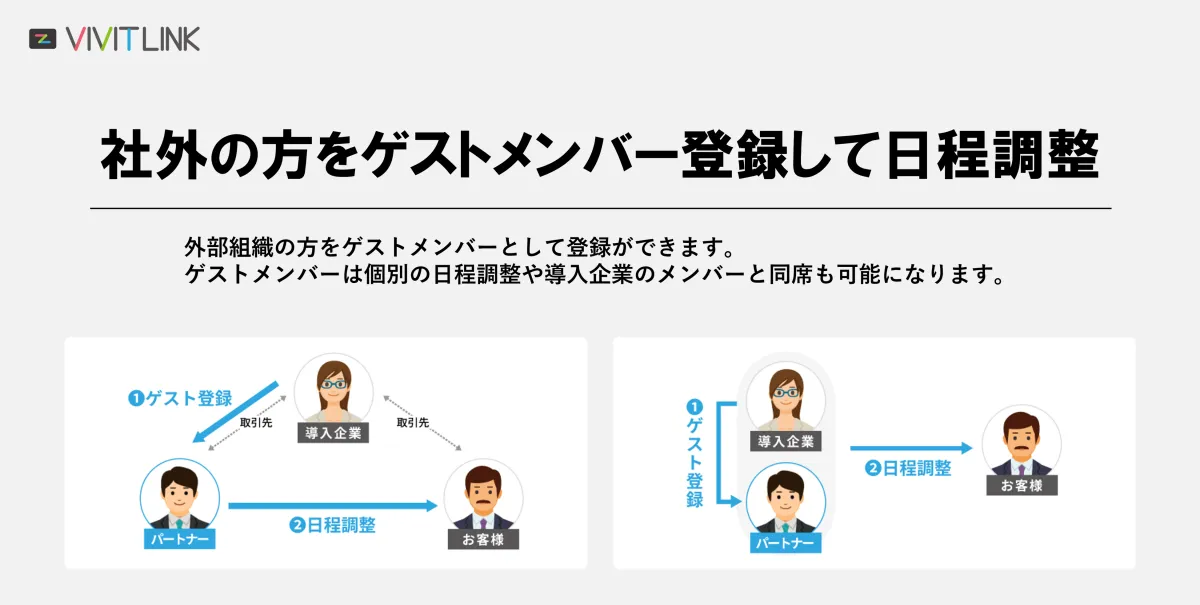 また、自社メンバーとの同席が求められる際に、外部のゲストメンバーを加えた調整も可能となります。このように、ゲストメンバー機能は様々な場面で活用でき、業界の垣根を超える効果が期待されます。