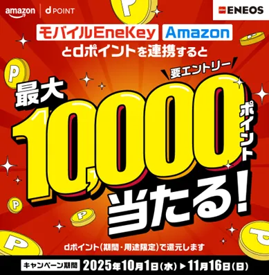株式会社NTTドコモは、2025年10月1日から11月16日までの期間において、「モバイルEneKey」と「Amazonアカウント」とdアカウントを連携することで、最大10,000ポイントが当たる新たなキャンペーンを実施します。このキャンペーンに参加することで、抽選で期間限定のdポイントを獲得するチャンスが広がります。