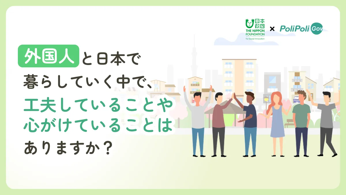 日本財団とPoliPoliが共同で実施するこの意見募集は、外国人と日本人の間の理解を深めるための素晴らしい機会です。多様な視点から意見を交換し、今後の支援のあり方を共に考えましょう。皆様の貴重なアイデアをお待ちしています。詳細は