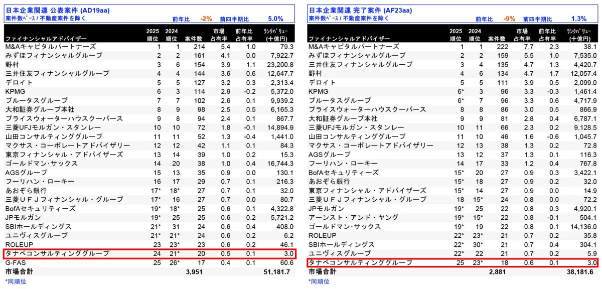 今回の「日本M&Aレビュー」において、タナベコンサルティンググループは日本企業関連の公表案件数において24位、そして完了案件においては25位という位置に入っています。また、中規模市場においても、5億米ドル以下の公表案件で21位、5千万ドル以下の公表案件では19位と、高い評価を得ています。これにより、タナベコンサルティンググループは国内M&A市場での重要なプレイヤーとしての地位を一層確立しました。