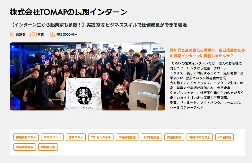 TOMAPは、ただのインターンシップにとどまらず、参加する学生が自ら考え行動できる人材になってほしいと考えます。ヒアリングから提案、クロージングまで一連の業務を経て、実践的なビジネススキルを磨くチャンスです。