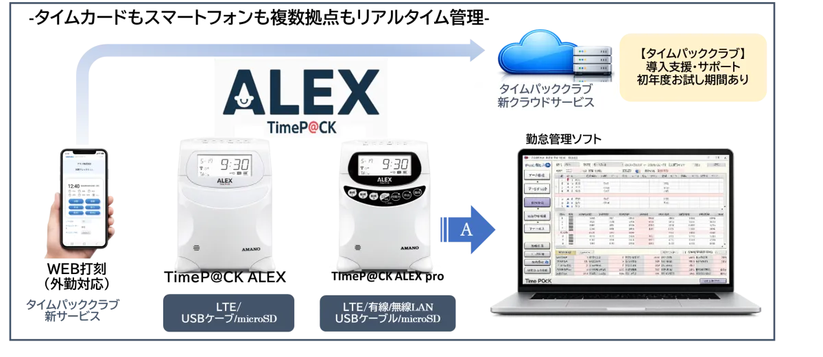 「TimeP@CK ALEX」は、旧モデルからのスムーズな移行が可能で、既存の勤怠ルールや設定をそのまま引き継ぐことができます。これにより、企業は教育コストやリスクを最小限に抑えることが可能です。また、LTE・有線LAN・無線LANを利用した通信機能が強化されており、運用方法の選択肢も広がりました。