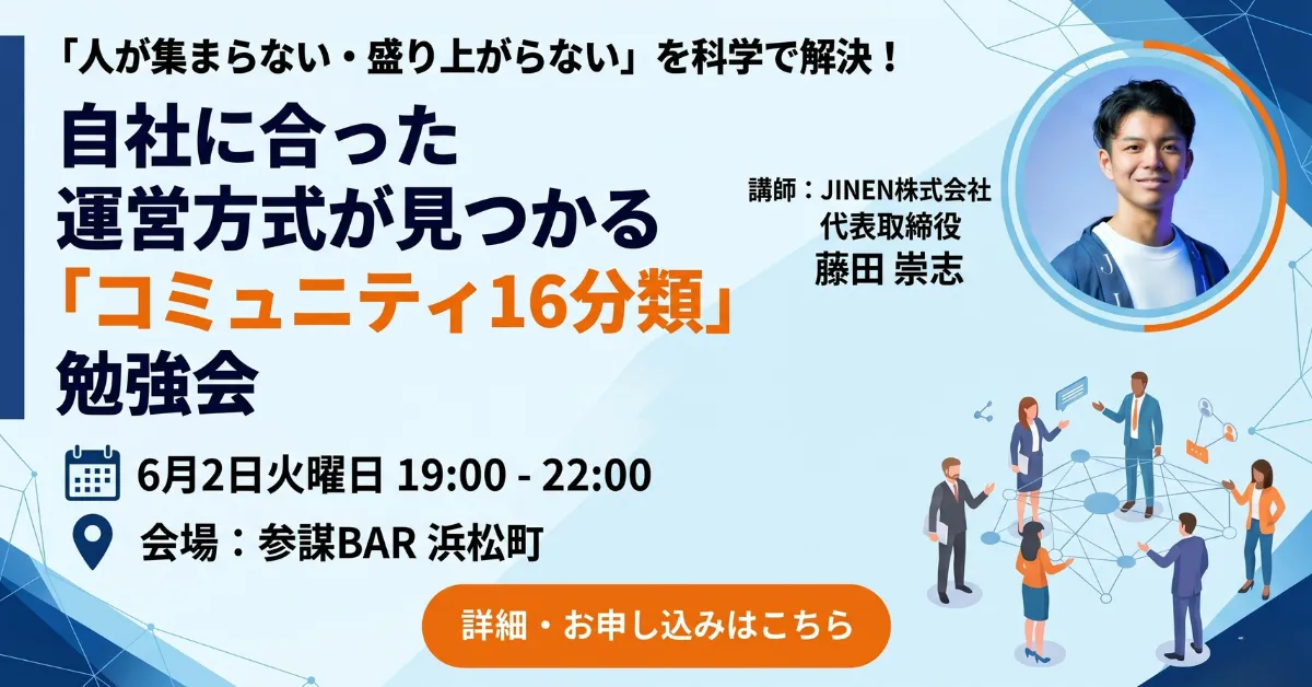 株式会社経営参謀が主催する勉強会が、2026年6月2日(火)に東京都港区で開催されます。このイベントの目的は、経営者やコミュニティ運営に関与する方々に、科学的エビデンスに基づく「コミュニティ16分類」を学び、自社のコミュニティの設計や運営方法を最適化することです。