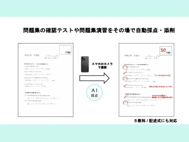 生徒にとって、このAI採点技術は大きなメリットをもたらします。スマートフォンでカメラを使用することで、答案を簡単に入力でき、返却までの時間が短縮されます。これにより、学んだ内容をすぐに復習できる環境が整い、学習効果が高まります。また、学習記録に基づいて提案されるおすすめ問題を通じて、効率的な復習が行え、添削付きの返却が実現されるため、さらなる理解が深まります。