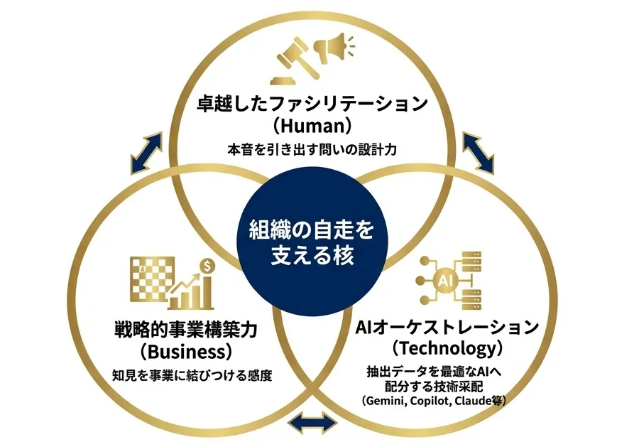 ナレッジ・コーディネーターは、組織が自走できる土台を築くための重要な役割を担います。彼らの主な任務は、組織内に潜む「摩擦」や「熱量」を引き出し、この情報を最適な形でAIに供給することです。このプロセスにより、メタ認知が生まれ、組織が自立した意思決定を行う力を育むのです。