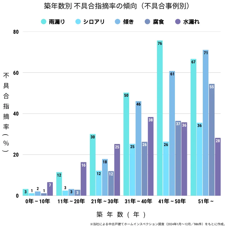首都圏では、中古戸建ての成約件数が前年比62.8%増加し、7ヶ月連続で増加しています。特に築年数に関連する不具合が目立ちます。築20年を境に、各種不具合の発生率が急激に上昇していることが観察されています。傾きの発生率は、築11年~20年で3.3%に対し、築21年~30年では17.9%に達しています。この傾向から、中古住宅購入時のリスクを見極める重要性が浮かび上がります。