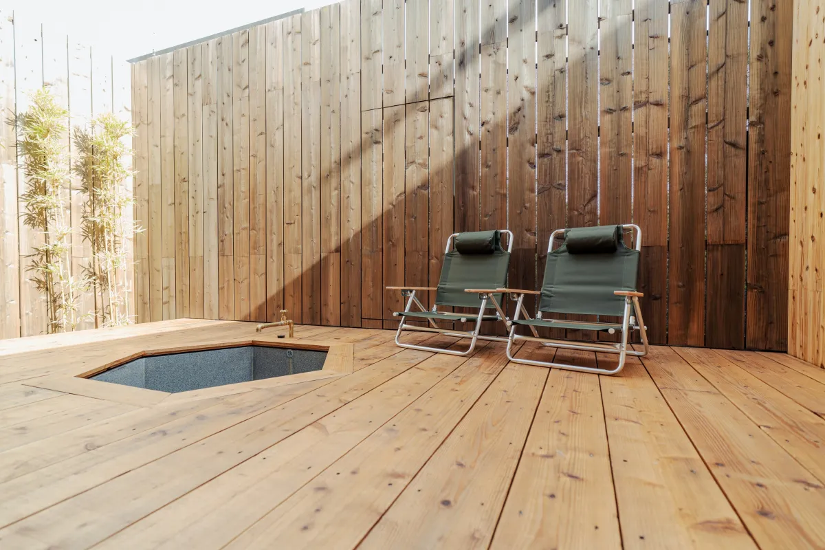 「hanare」のサウナは、広々とした4人用のサウナ室を完備しています。ここではセルフロウリュも楽しめ、心地良い蒸気に包まれて体を温めることができます。また、水風呂は井戸水を使用しており、その柔らかい水質が肌を優しく包み込みます。客室とテラスがシームレスに行き来できるため、サウナと外の風を感じながらリラックスすることも可能です。