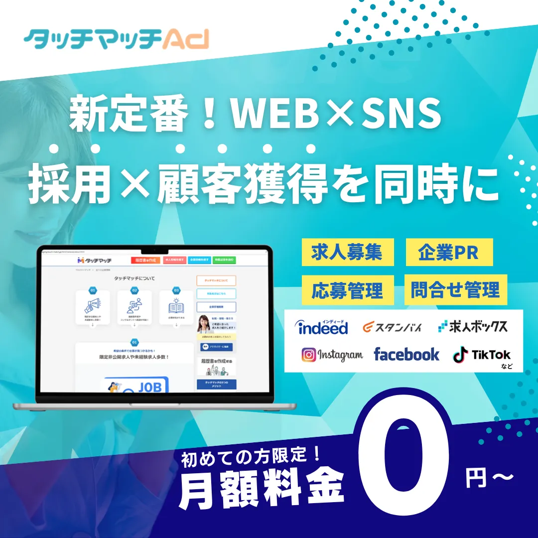 「タッチマッチAd」は、企業が求人募集とPR活動を同時に進行できる革新的なサービスです。簡単な操作で効果的な募集が可能となり、SNSを通じて企業のビジョンや文化を伝えることができるため、多くの企業にとって理想的な選択となるでしょう。興味を持たれた方は、ぜひ公式サイトでの無料登録をお勧めします。