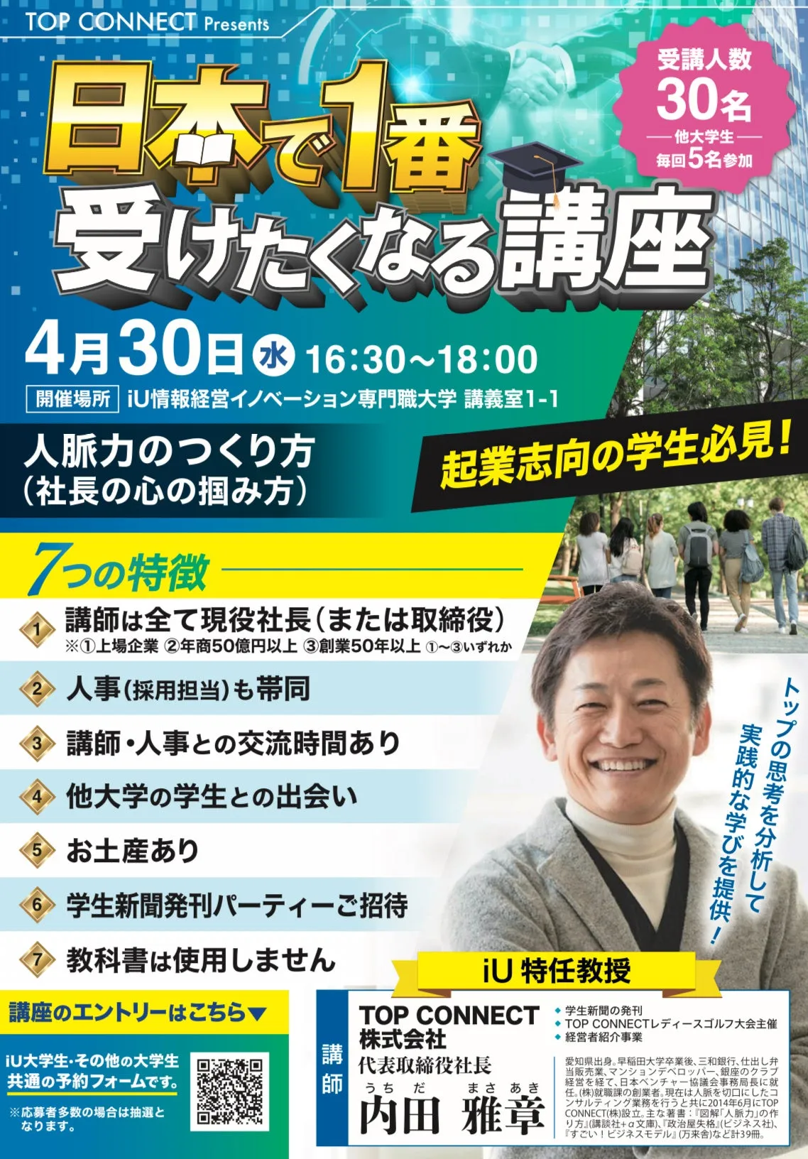 初回の開催は、2025年4月30日(水)の16時30分から18時まで、iU情報経営イノベーション専門職大学の講義室で行われる予定です。内田雅章さん自身もこの講座を通じて、学生に向けて『人脈力の作り方』を伝授する予定で、彼の豊富な経験からくる実践的な知識が期待されています。