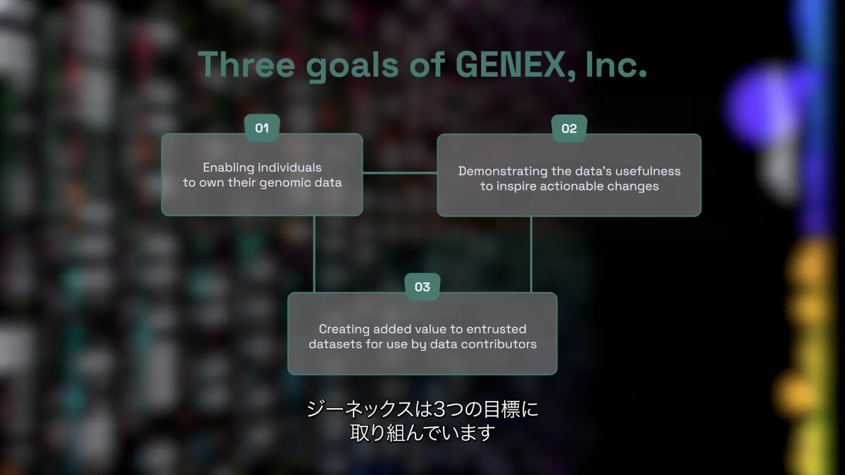 ジーネックス株式会社が新たに公開したコーポレートメッセージ動画は、「個人が自らのデータを持ち、考え、行動する」というビジョンをお伝えする内容となっています。この動画は、米国カリフォルニア州ロサンゼルスで開催される第69回米国生物物理学会年次総会でも放映され、多くの研究者や医療従事者にご覧いただける予定です。