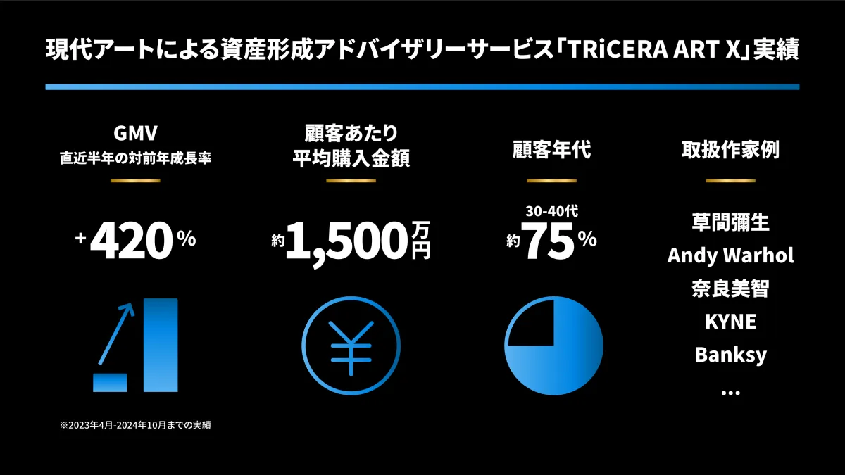 リニューアルの背景には、現代アート市場の成長があります。TRiCERAでは、直近半年で対前年成長率が420%を記録するなど、市場の拡大を実感しています。2024年10月には、月次流通総額として過去最高の約2億5000万円を達成しました。