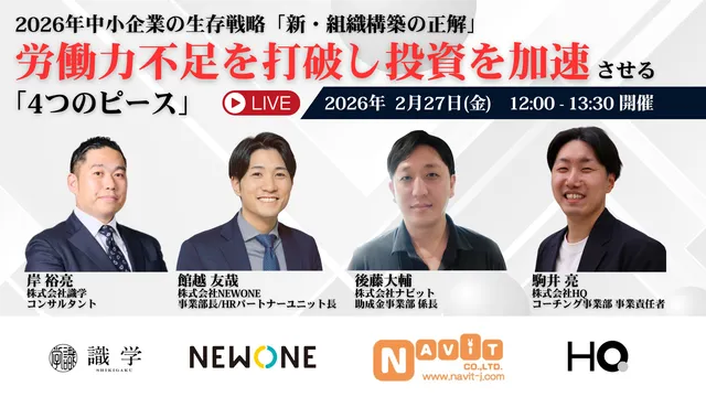 このような背景のもと、2026年を見据えた中小企業向けの無料ウェブセミナー「2026年中小企業の生存戦略『新・組織構築の正解』」が開催されます。このセミナーでは、労働力不足を解消しつつ、成長の鍵となる投資を加速するための4つのピースを詳細に解説します。