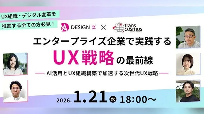 トランスコスモス株式会社は、2026年1月21日(水)にオンラインセミナー「エンタープライズ企業で実践するUX戦略の最前線─ AI活用とUX組織構築で加速する次世代UX戦略─」を開催します。このセミナーでは、デジタル時代において企業が勝ち抜くための重要な要素となるユーザーエクスペリエンス(UX)に焦点を当て、具体的な実践方法や最新の戦略を紹介します。