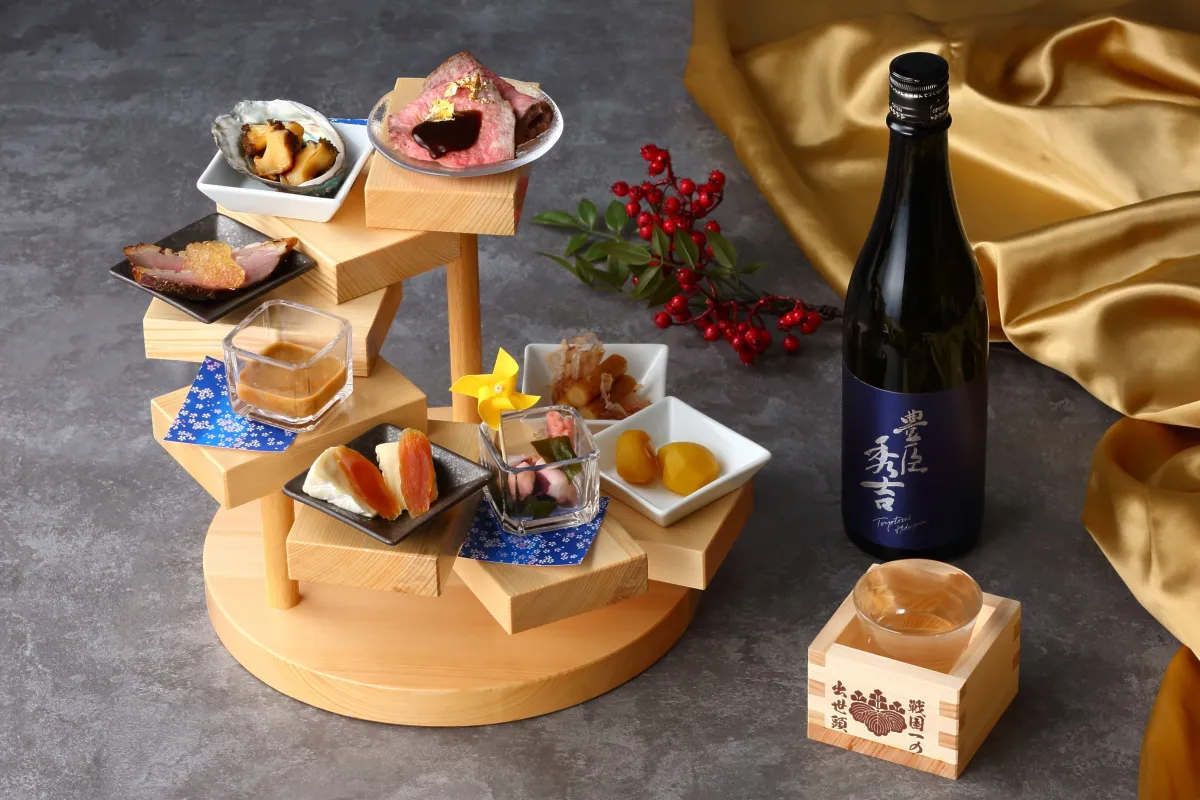 さらに、各料理のサイドには、純米吟醸「豊臣秀吉」を枡酒で楽しめるオプションも用意されています。枡は秀吉の時代に基準を統一した単位とされ、まさに歴史を感じる一杯となっています。これにより、料理とともに酒の風味も一層引き立ち、贅沢なひとときを演出します。