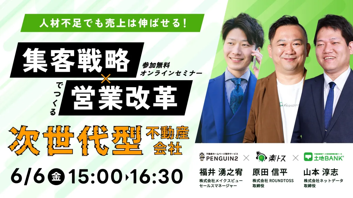 不動産会社向けネット情報サービスツール「土地バンク」を1,100社以上へ提供し、業界のDXを推進する株式会社ネットデータ(本社:岡山県岡山市)が、3,000件を超える豊富なサイト制作実績を持つ株式会社メイクスビュー(本社:大阪府大阪市)、そして「80秒スピード反響対応」で追客を最適化する株式会社ラウンドトス(本社:京都府京都市)とタッグを組み、「人材不足でも売上は伸ばせる!集客戦略×営業改革でつくる次世代型不動産会社」と題した無料のタイアップセミナーを6月6日(金)に開催します。