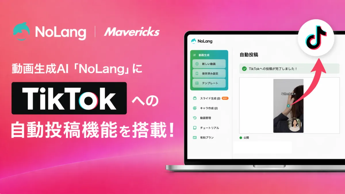 株式会社Mavericks(本社:東京都文京区)が提供する動画生成AI「NoLang」が、TikTokへの直接投稿を可能にする「TikTok連携機能」を発表しました。この機能により、企業は煩わしい動画制作プロセスを一新し、SNS運用の工数を大幅に削減できるようになります。特に、最近増加している企業のSNS活用に対する課題解決の一手として期待されています。