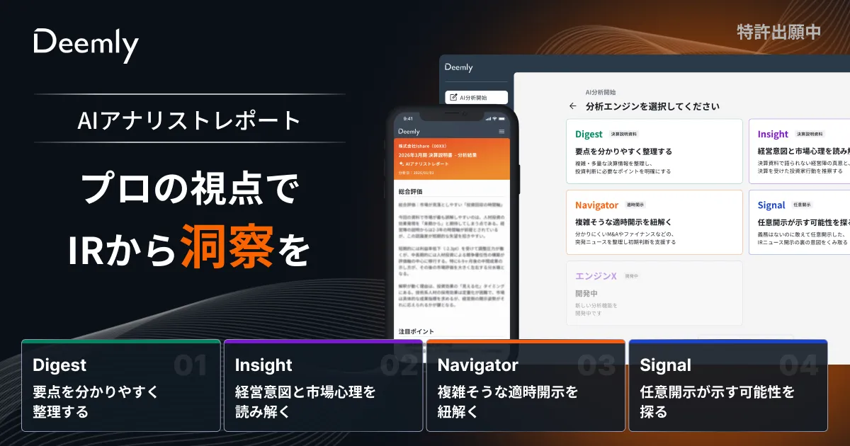 Deemlyは、アナリストによる推奨ポイントや洞察を含む詳細なレポートを数分で生成し、投資家が判断を下す手助けをします。投資家は情報を迅速に入手し、より良い判断を行えるようになります。これにより、IR情報が本来持つ価値が最大限に引き出されることが期待されます。
