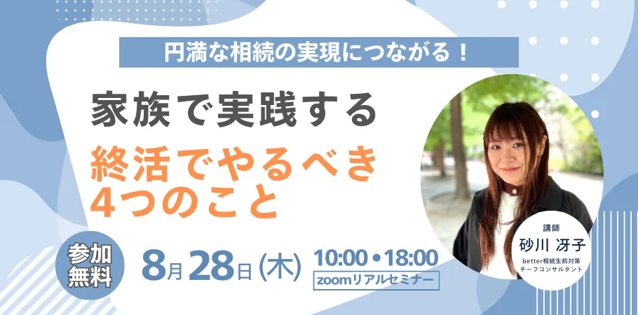 このセミナーでは、家族が将来の相続に備えて実践すべき4つの重要なことを学びます。「終活」を考え、家族間のコミュニケーションを深めるためのきっかけを提供することが目的です。