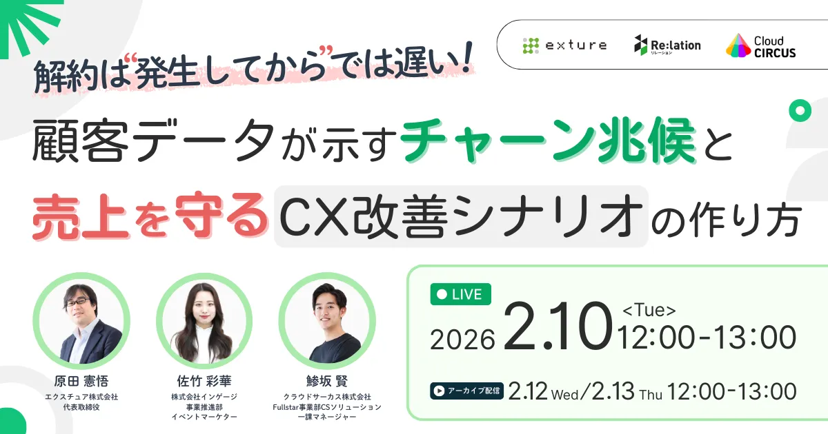 株式会社インゲージは、エクスチュア株式会社、クラウドサーカス株式会社との3社共催で、ウェビナー『解約は“発生してから”では遅い!顧客データが示すチャーン兆候と、売上を守るCX改善シナリオの作り方』を2026年2月10日(火)12:00から開催します。このウェビナーでは、顧客の解約予兆をデータで捉え、売上を守るための具体的な手法を学ぶことができます。