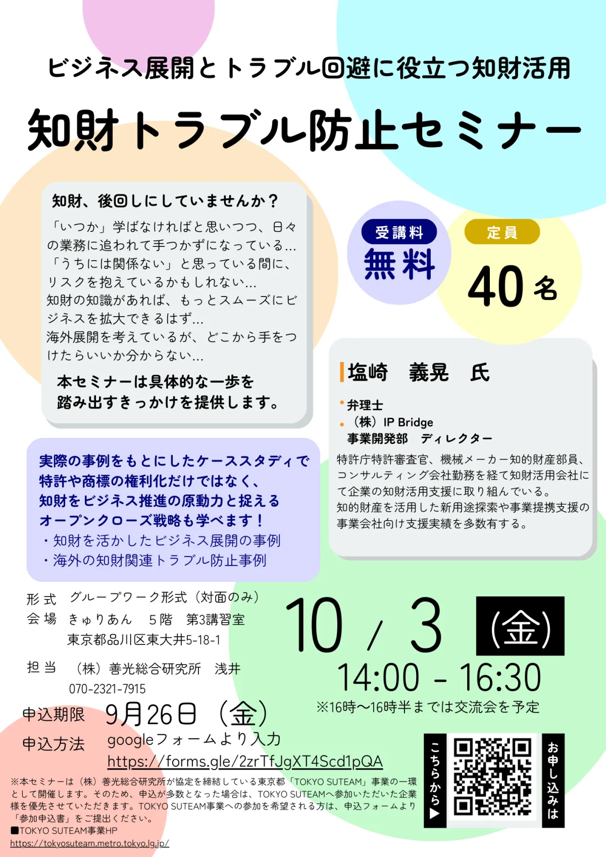 株式会社善光総合研究所は、10月3日(金)に、スタートアップ企業を対象とした「知財トラブル防止セミナー」を無料で実施します。このセミナーでは、現役弁理士が進行し、知的財産を効果的に活用し、ビジネス展開に役立てるための具体的な手法を学ぶことができます。