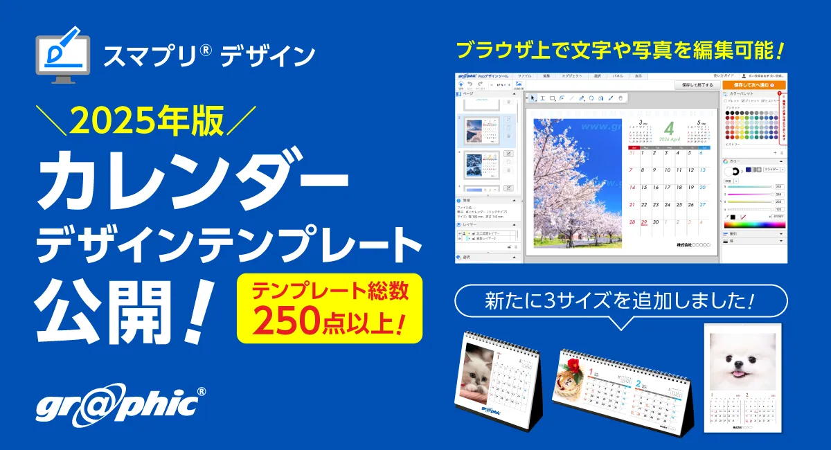 このサービス「スマプリ®デザイン」では、ブラウザ上で簡単にテンプレートの文字や写真を入れ替えることができます。あらかじめ日付が書かれた250点以上のデザインテンプレートが用意されており、社名や写真を差し替えるだけでオリジナルなカレンダーを作り出せます。シンプルなデザインから、写真を大胆に配置できるタイプまで、さまざまなスタイルが揃っているのも大きな特徴です。
