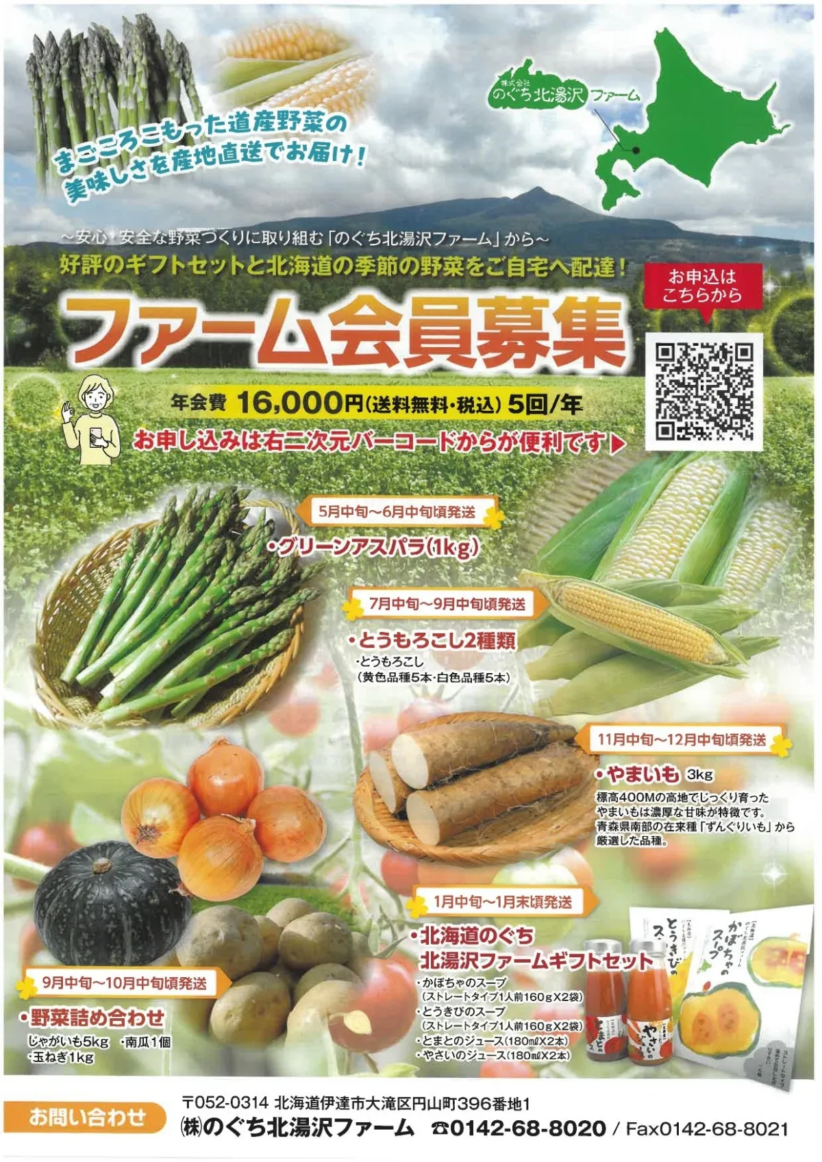 のぐち北湯沢ファームの会員プログラムは、北海道の地元野菜を楽しみながら、健康的な生活をサポートする素晴らしい機会です。特に、四季折々の新鮮な野菜を自宅で手軽に味わいたい方や、贈答用のギフトセットをお探しの方には最適です。ぜひこの機会を逃さず、お申込みをお待ちしております!