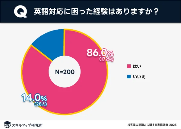 これによると、業務で英語を使用した経験がある接客業関係者の中で、なんと86%が「英語対応に困った」と回答しています。このデータは、英語での対応スキルが不足していることを如実に示しており、訪日客へのサービスが不十分である可能性を示唆しています。
