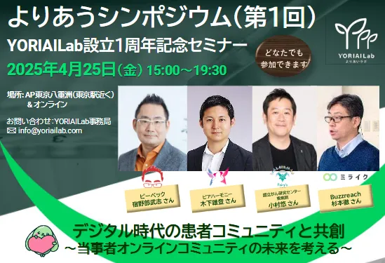 2025年4月25日、一般社団法人YORIAILabが法人設立1周年を迎え、特別なシンポジウムを開催します。このシンポジウムは、「当事者オンラインコミュニティの価値、課題、そして未来像」をテーマに、疾患を抱える人々の支援やそのコミュニティについて深く考える場となります。