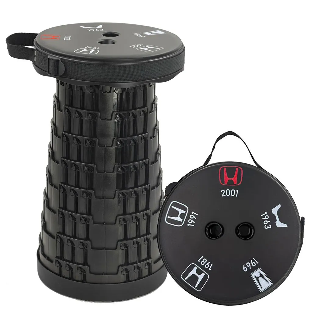 この折り畳みスツールには、いくつかの特長があります。まずはそのデザイン。天面に施されたHonda Hマークはひと目でその魅力を捉え、ファンにとってはたまらないディテールです。さらに、クッション素材を使用した座面は、長時間の使用でも快適です。\
