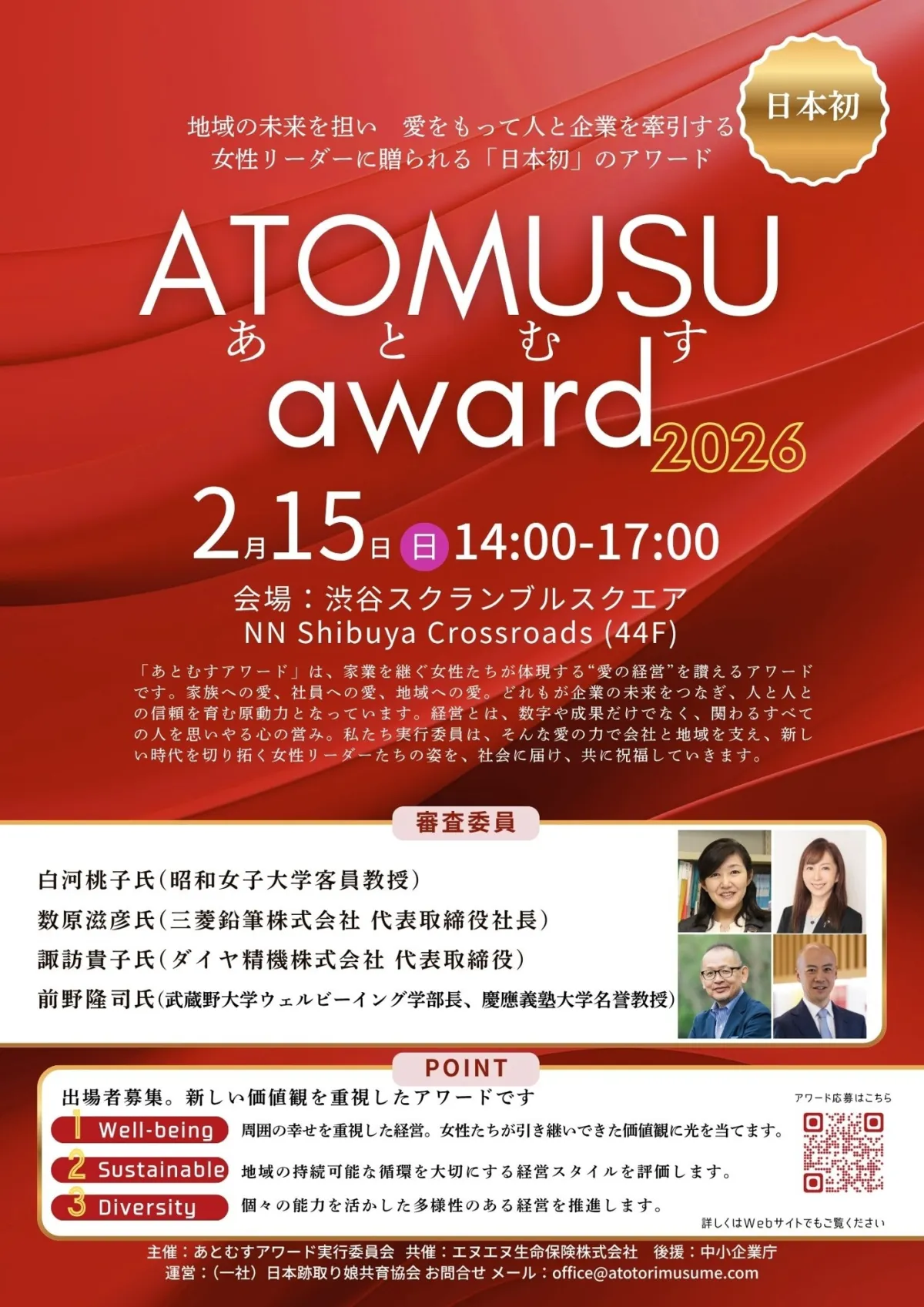 授賞式は2026年2月15日(日)、渋谷スクランブルスクエア44階で開催されます。プログラムはファイナリストによるプレゼンテーションや審査員の講評、最優秀賞の発表・表彰式を含み、注目の審査員としては、昭和女子大学の白河桃子教授や三菱鉛筆の数原滋彦社長などが名を連ねています。