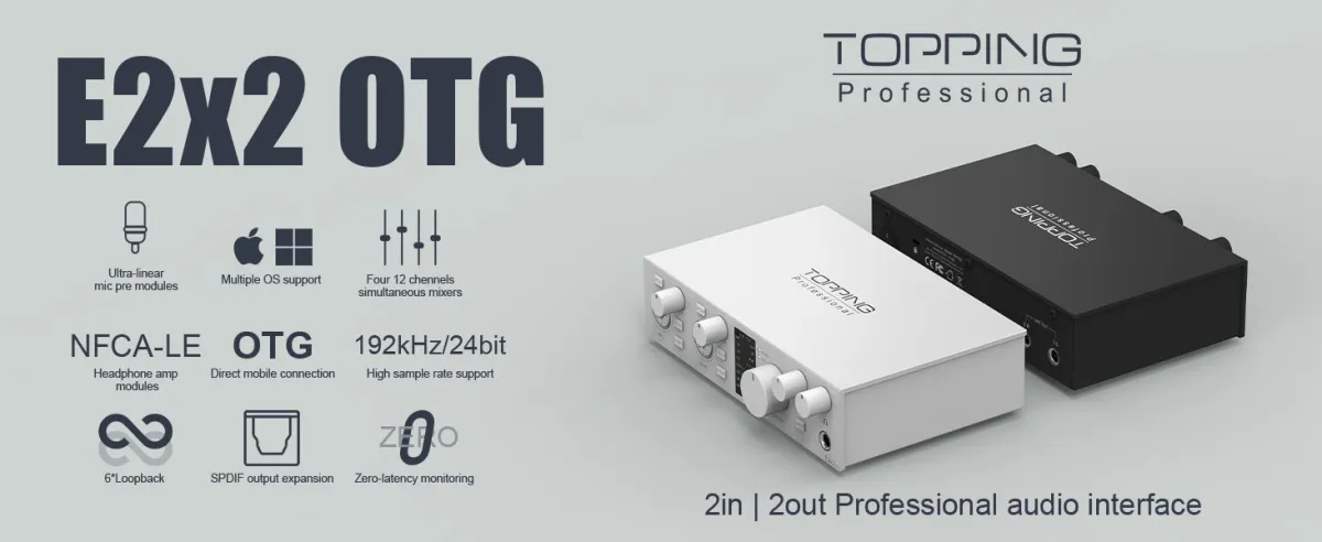 e2x2 OTGには、48Vファンタム電源スイッチを装備しており、コンデンサーマイクの使用も可能です。多様なマイクとの接続をサポートし、更に自由な音作りを実現します。また、「TOPPING Professional Control Center」を利用することで、オーディオエフェクトの調整やシグナル管理が簡単に行え、多彩なクリエイティブニーズにも対応しています。