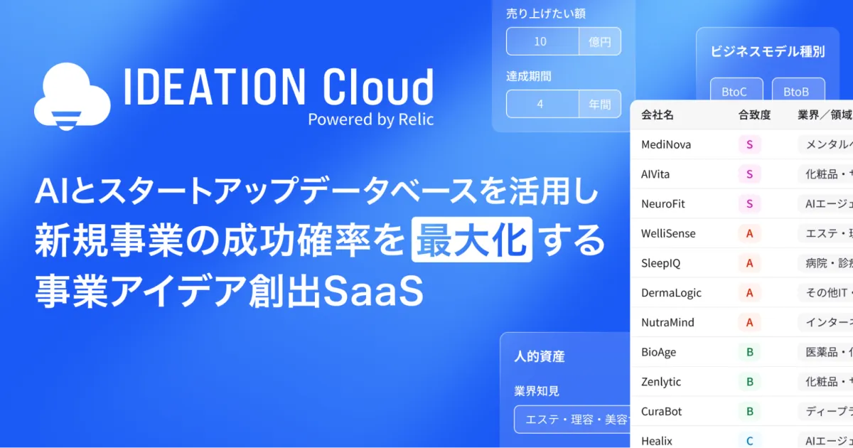 事業共創カンパニーの株式会社Relicが新たに参入したサービス、「IDEATION Cloud」は、生成AIと独自に構築された国内外のスタートアップデータベースを駆使し、新しい事業アイデアの創出を支援します。このサービスは、7月9日より正式に提供が開始され、企業の新規事業成功確率を最大限に引き上げることを目的としています。