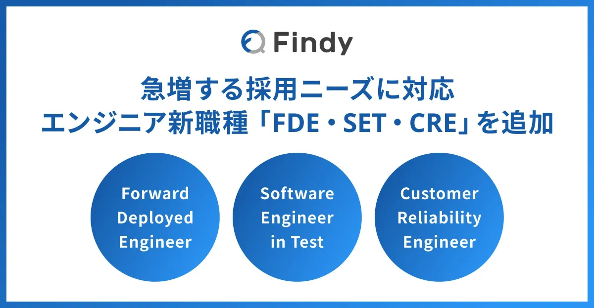 ファインディ株式会社(東京都、代表取締役:山田裕一朗)は、ハイスキルエンジニア向け転職サービス「Findy」で新しく「FDE」「SET」「CRE」という三つの職種を追加することを発表しました。この新たな職種の追加は、生成AIやAIエージェントの普及に伴うソフトウェア開発の現場での変化に応えるものです。