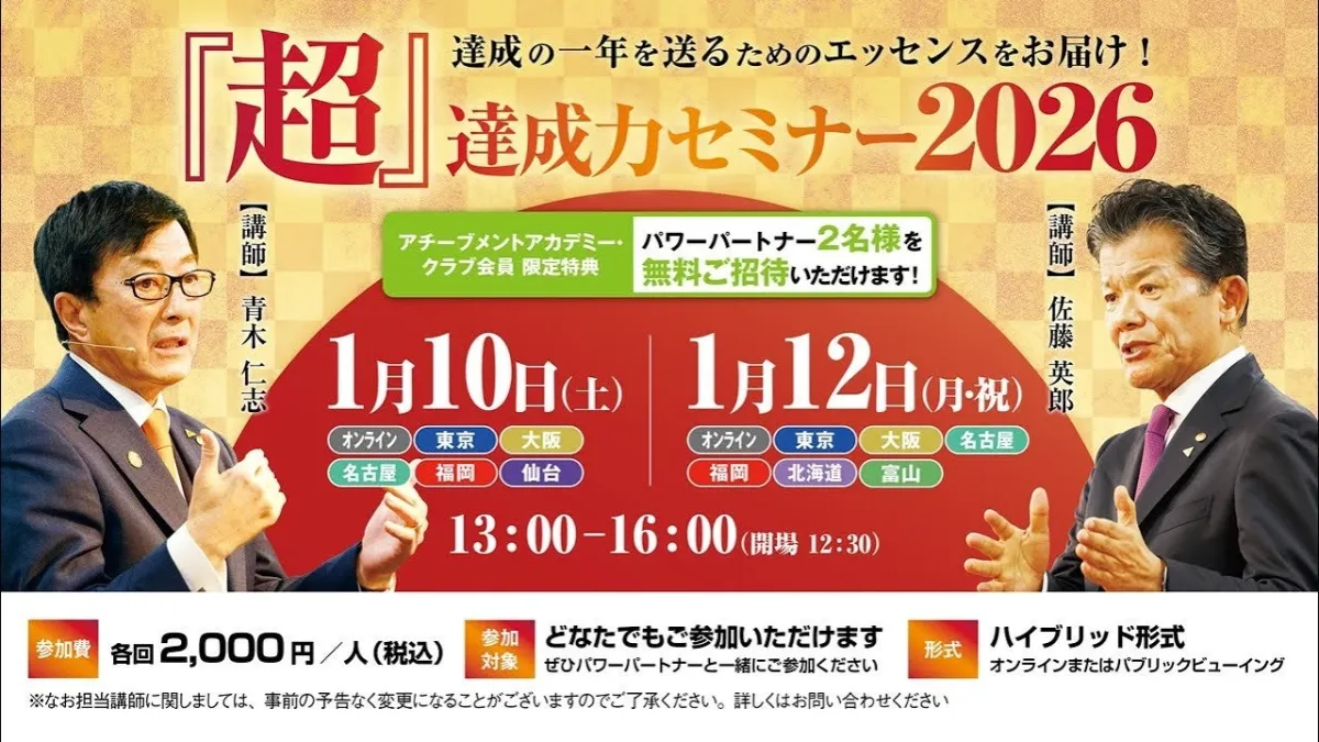 2026年1月10日と12日の、計180分のセミナーでは、長年にわたって延べ51万人以上をサポートした実績を持つプロフェッショナルから「達成の技術」を学ぶことが可能です。特に、目標設定の手法や行動管理術に関する内容は、新しい年に向けて確実に役立つでしょう。