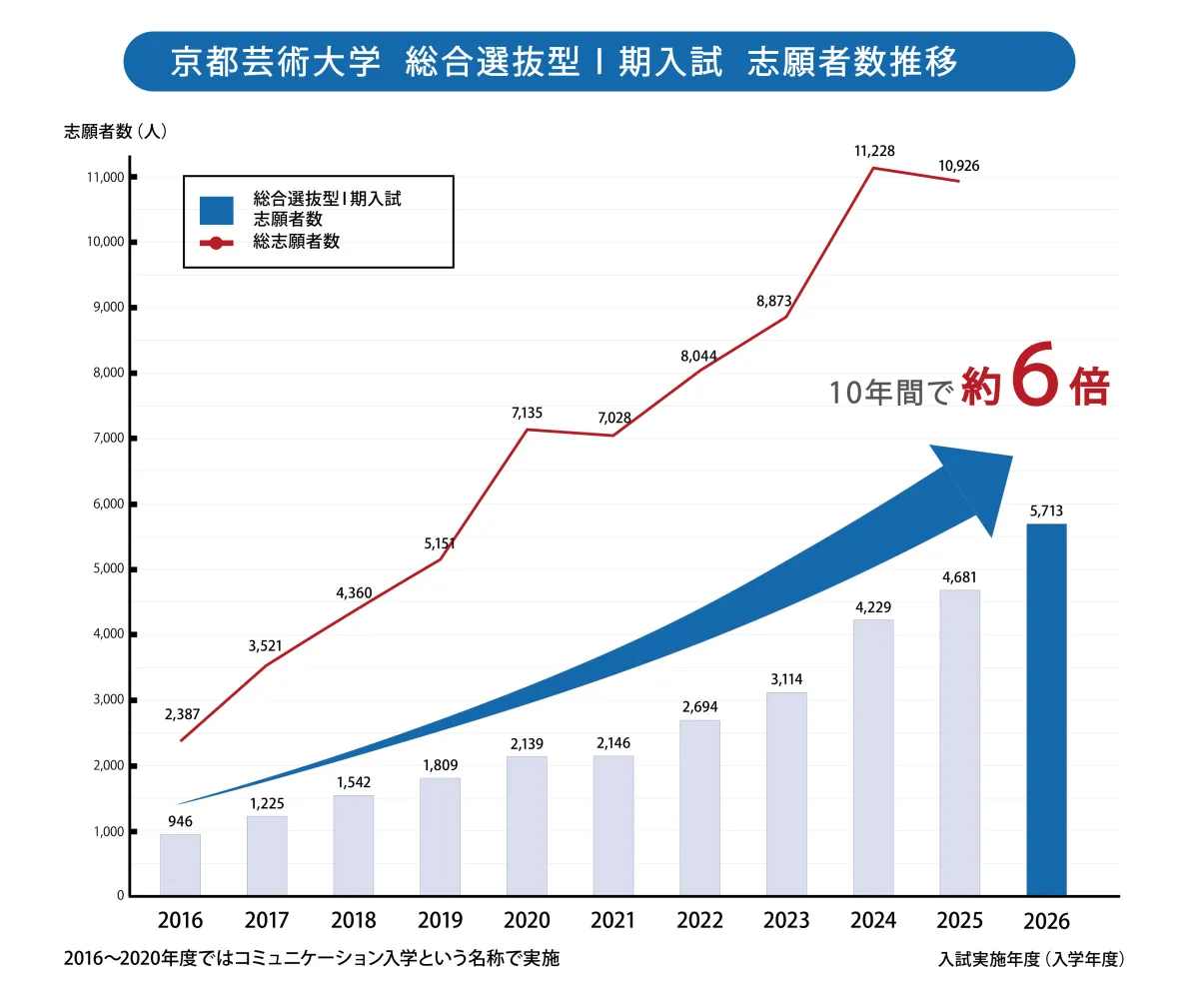 大学教育は常に進化を遂げてきましたが、現在「大学淘汰時代」と呼ばれる環境に直面しています。少子化の影響により、多くの私立大学が定員割れや赤字経営に悩む中、京都芸術大学(京都市左京区)の取り組みは注目されています。この大学は、2026年度入試の「総合型選抜型Ⅰ期」において過去最高の志願者数5,713名を記録し、前年比130%の増加を達成しました。これは、長年培ってきた「体験授業型入試」に加え、新たに実施した「探究プロセス型」入試が影響しています。