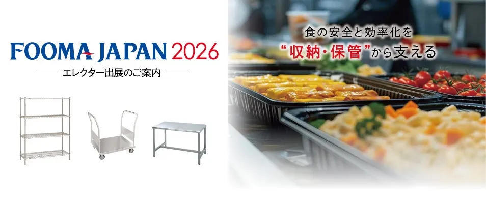 エレクター株式会社は、2026年に東京ビッグサイトで開催される「FOOMA JAPAN 2026」に出展します。展覧会の期間は6月2日から5日までの4日間で、エレクターブースの番号はE7-16-17です。