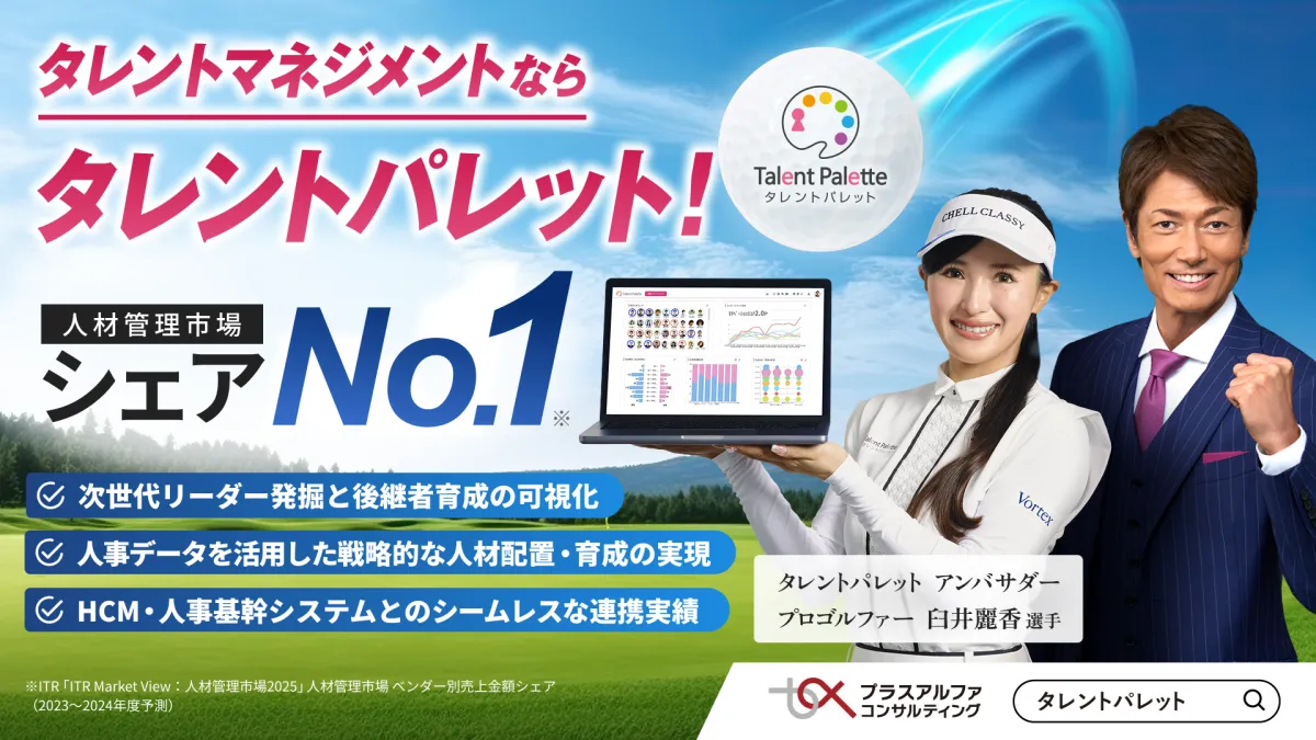 株式会社プラスアルファ・コンサルティングが提供する、タレントマネジメントシステム「タレントパレット」の新CMに、プロゴルファーの臼井麗香選手が出演することが発表されました。このCMは、彼女とタレントマネジメントシステム代表のマイケル富岡さんが織りなすコミカルなやりとりを描いています。