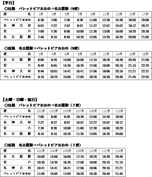 - - 運行ルート: パレットピアおおの〜名古屋駅(東海環状道自動車道・名神高速道路)