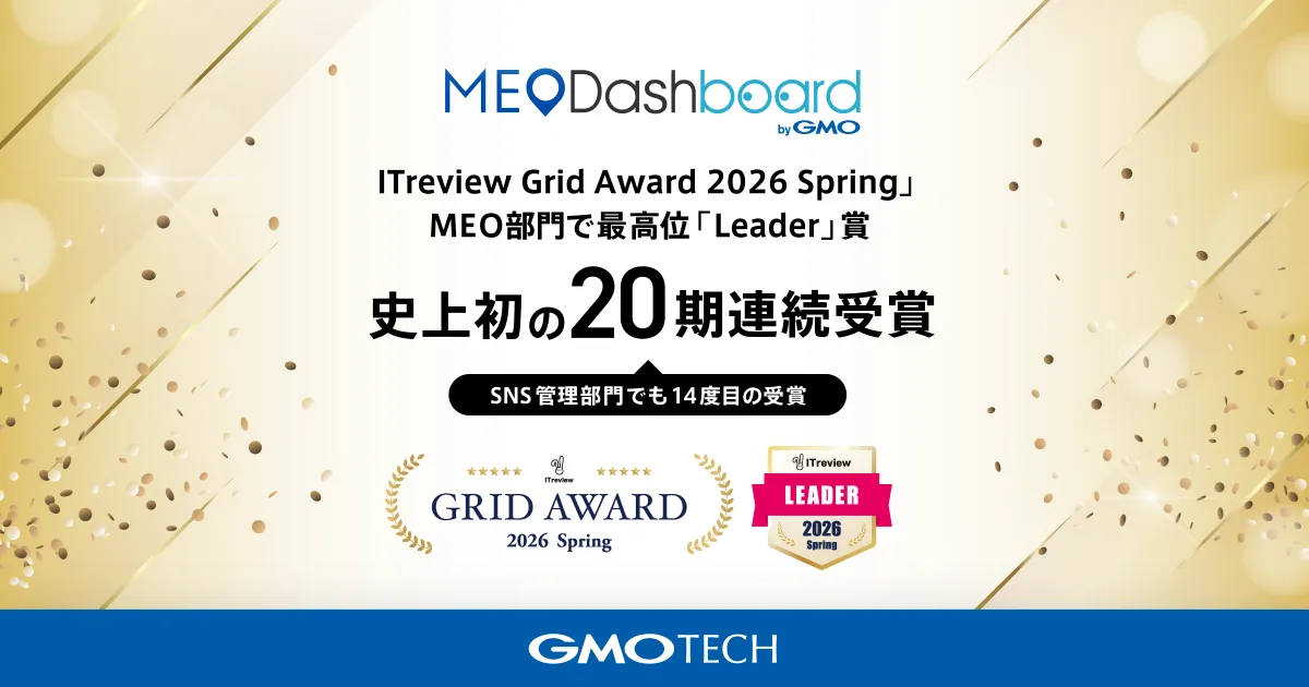 GMO TECH株式会社が開発した「MEO Dashboard byGMO」が、2026年春に開催された「ITreview Grid Award 2026 Spring」で、ついにMEO部門の最高位である「Leader」賞を史上初めて20期連続で受賞しました。この受賞は、MEO部門において前例のない成果となり、その特長や機能に絶大な信頼が寄せられていることを示しています。