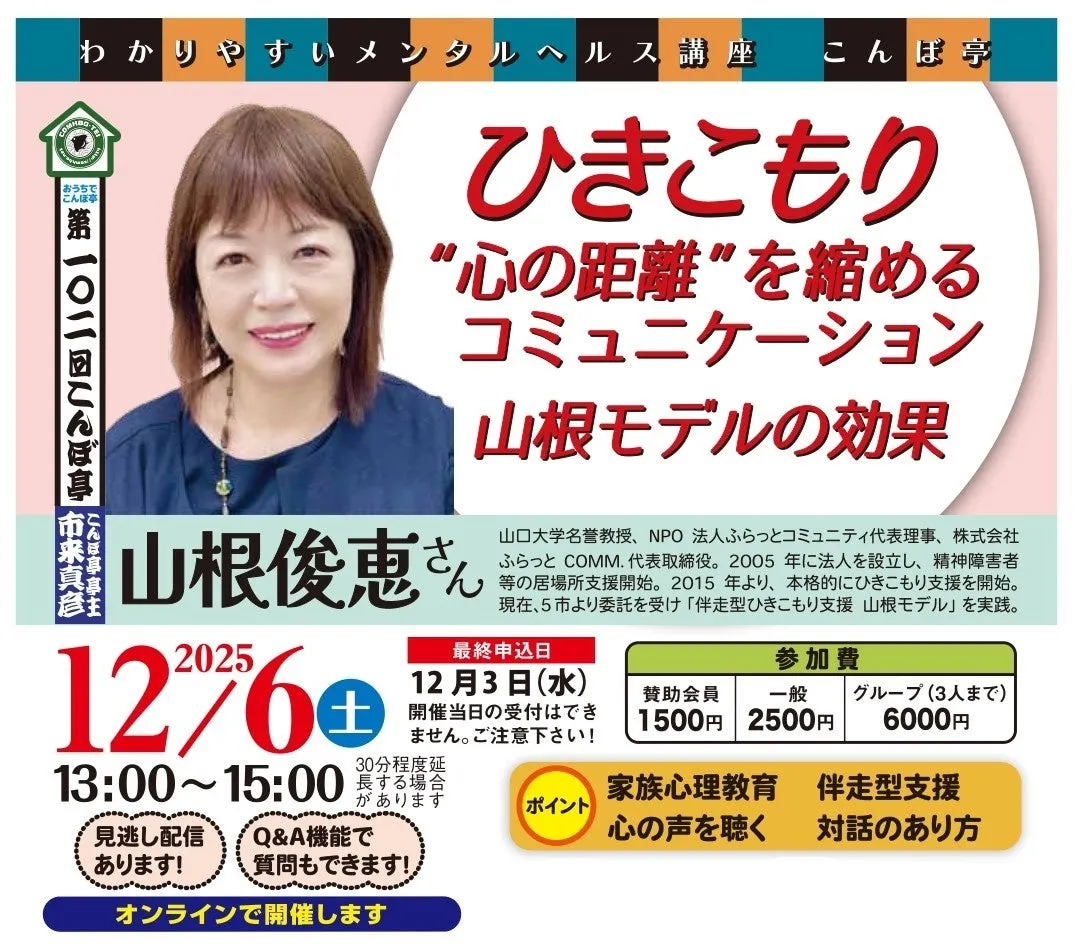 特定非営利活動法人地域精神保健福祉機構(通称:NPO法人コンボ)が主催する「こんぼ亭月例会」は、メンタルヘルスに関する講演会シリーズです。毎回、多様なお客様を招き、心の健康に関する重要なテーマを取り扱っています。今回は、2025年12月6日(土)に「ひきこもり」をテーマにしたオンラインイベントが予定されています。