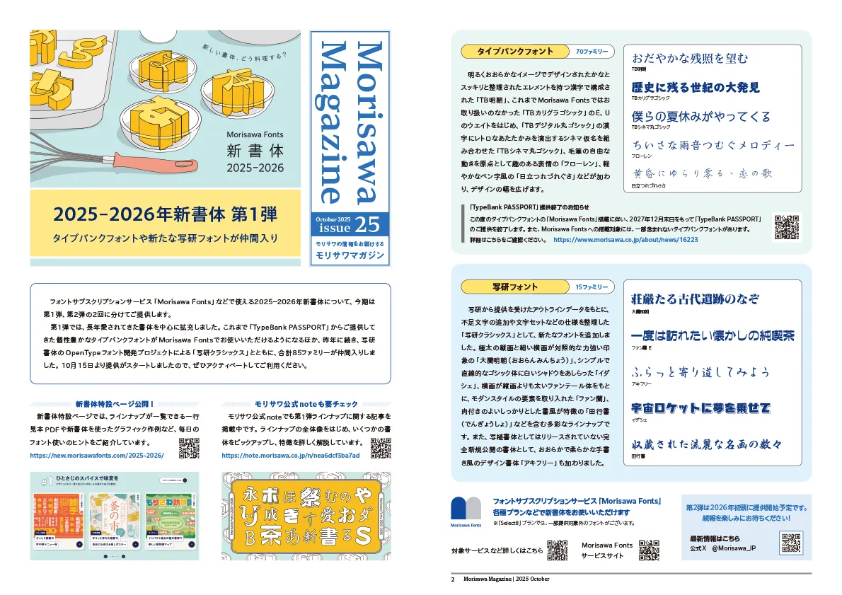 株式会社モリサワは、企業の情報をお届けする広報誌「MORISAWA MAGAZINE」の最新号を発行し、2025-2026年の新書体の第1弾をお披露目しました。この広報誌は、DTPに関する情報やフォントのトレンド、豆知識など、様々なコンテンツを通じて広い読者層に向けて発信しています。
