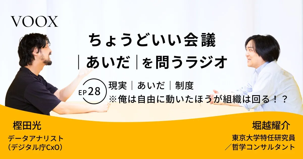 音声メディアVOOXでは、知識を深めることを目的とした新たなシリーズがスタートしました。その名も「ちょうどいい会議|あいだ|を問うラジオ」。今回はエピソード28として「現実|あいだ|制度」というテーマで配信されています。