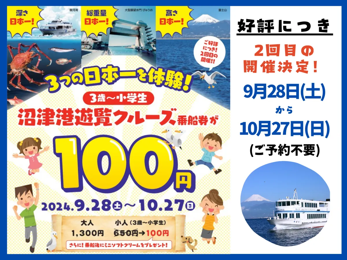 9月28日(土)から10月27日(日)までの約1ヶ月間、3歳から小学生までのお子様を対象に、通常650円の乗船料金がなんと100円に!