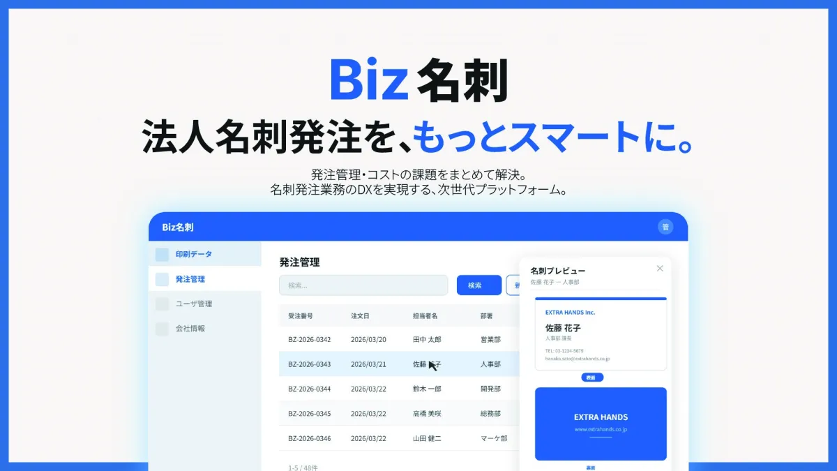 企業における名刺管理や発注がよりスマートに進化しました。株式会社サムライソードが運営していた『マイ名刺 biz』が名称を『Biz名刺』に変更し、2026年4月からその運営を100%子会社の株式会社エクストラハンズに移管することが発表されました。これにより、名刺発注の利便性がさらに向上することが期待されています。