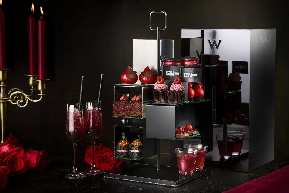 「EN-CHANTED BITE」は、名前の通り、ENHYPENの名前の一部分と、ヴァンパイアを象徴する“Bite”を掛け合わせた遊び心あふれるネーミングです。洗練されたシックなデザインで、ENHYPENの独自のコンセプトを反映した不思議な世界を体験できます。特別にデザインされたブラックボックスのティースタンドは、シネマティックなエレガンスと豊かな味わいを融合させ、ムーディーな体験を提供します。