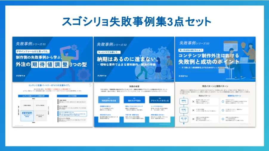 「スゴシリョ」は、100本以上の資料を制作した実績を持つ企業で、営業資料やホワイトペーパー、LP(ランディングページ)など多様な資料を取り扱っています。そこで発見した外注時の失敗パターンを分析し、それに対する対策をまとめた「失敗事例集」を作成しています。この資料は、BtoB企業のマーケティングや営業を担当している責任者に特に有用です。