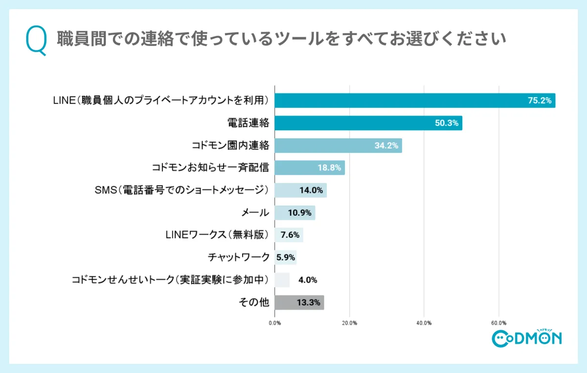 コドモンは全国の施設からのアンケート調査を実施し、その結果から業務連絡に関する課題を浮き彫りにしました。調査結果によると、75.2%の施設がLINEなどのプライベートアカウントを使用して業務連絡を行っていることが判明しました。多くの施設が「情報伝達に関する問題がある」と回答しており、職員間のコミュニケーションの質が問われています。