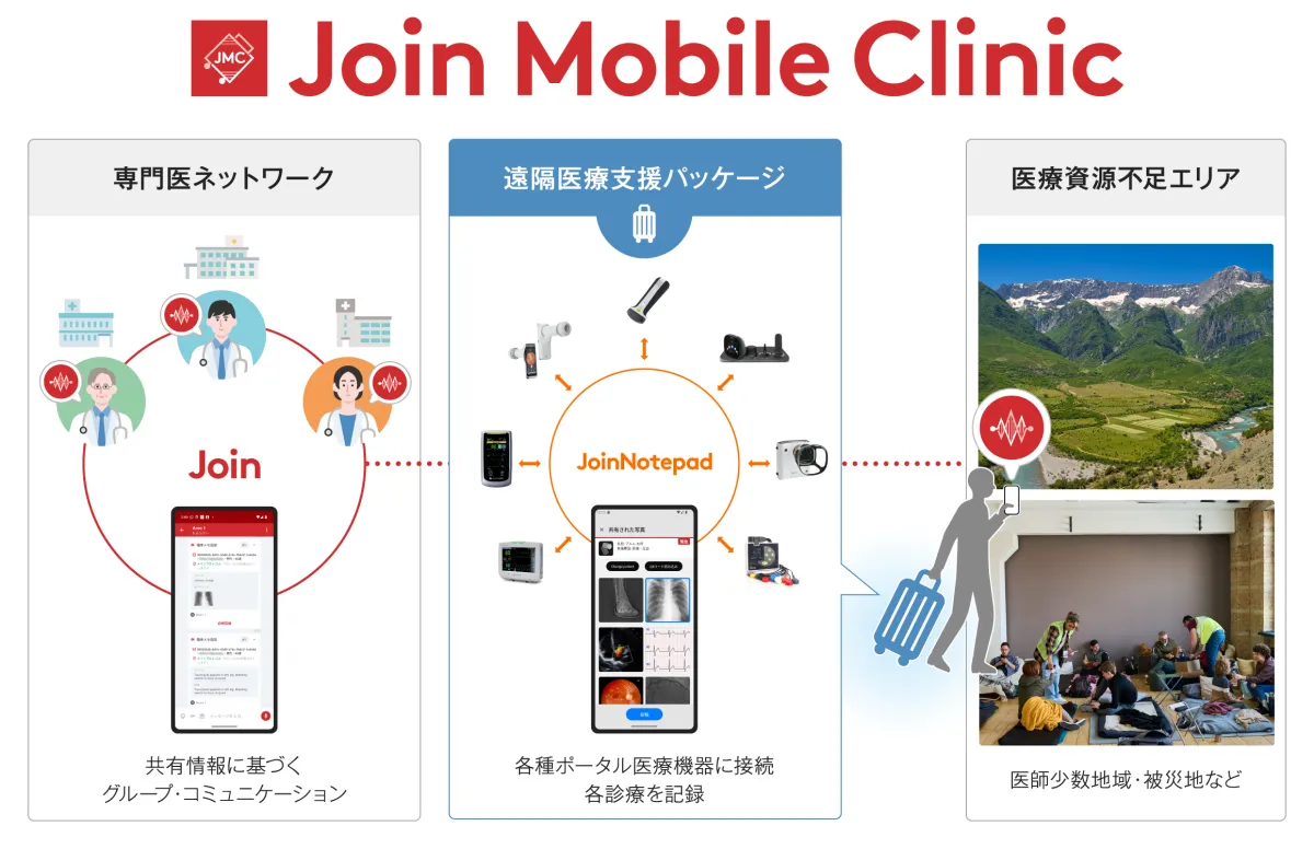 「Join Mobile Clinic」は、軽量のポータブル医療機器を中心に、診療記録システム「JoinNotepad」と医療者間のコミュニケーションアプリ「Join」を一体化したパッケージを提供します。これにより、医師同士の円滑な連携が可能となり、まるで移動する診療所のような形での遠隔診療が実現します。必要なときに、必要な場所で、質の高い医療を受けられるような仕組みが整っています。