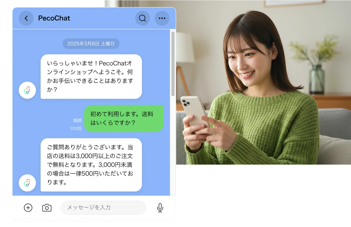 『PecoChat』は、OpenAIの技術を基にしたAIを採用しており、自然な会話ができるのが大きな特長です。営業時間外や休日でもAIが顧客の問い合わせにリアルタイムで応答し、皆さんの「返事がない」といった不満を解消します。